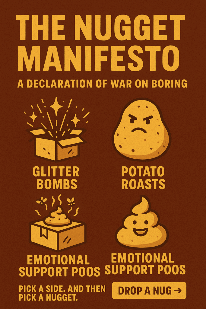 Listen up, turdlings. We didn’t claw our way out of the sewer just to make “cute novelty gifts.” No. Butt Nuggets was born to do one thing and one thing only: wage war on boring.